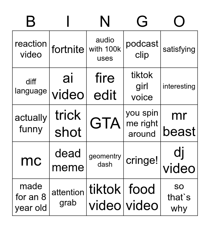 This bingo card has 25 words: dead meme, tiktok video, fire edit, made for an 8 year old, satisfying, reaction video, diff language, fortnite, you spin me right around, geomentry dash, tiktok girl voice, actually funny, cringe!, dj video, ai video, so that`s why, mr beast, audio with 100k uses, interesting, trick shot, GTA, attention grab, mc, podcast clip and food video.