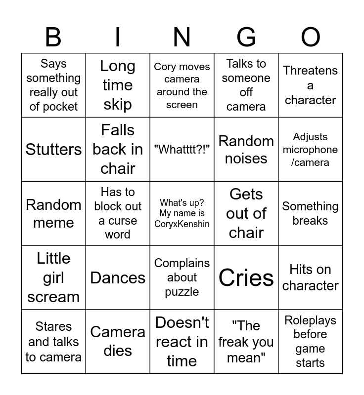 This bingo card has a free space and 32 words: "The freak you mean", Game forces him to do something stupid, Has to block out a curse word, Raps, Little girl scream, Falls back in chair, Threatens a character, Hits on character, Long time skip, Stops mid-dialogue, "Whatttt?!", Cory moves camera around the screen, Filter, Bullies a character, Gets out of chair, Stares disappointedly at camera, Stares and talks to camera, Random meme, Complains about puzzle, Dances, Cries, Gets killed, Something breaks, Camera dies, Roleplays before game starts, Talks to someone off camera, Random noises, Stutters, Says something really out of pocket, Doesn't react in time, References a different game and Adjusts microphone /camera.