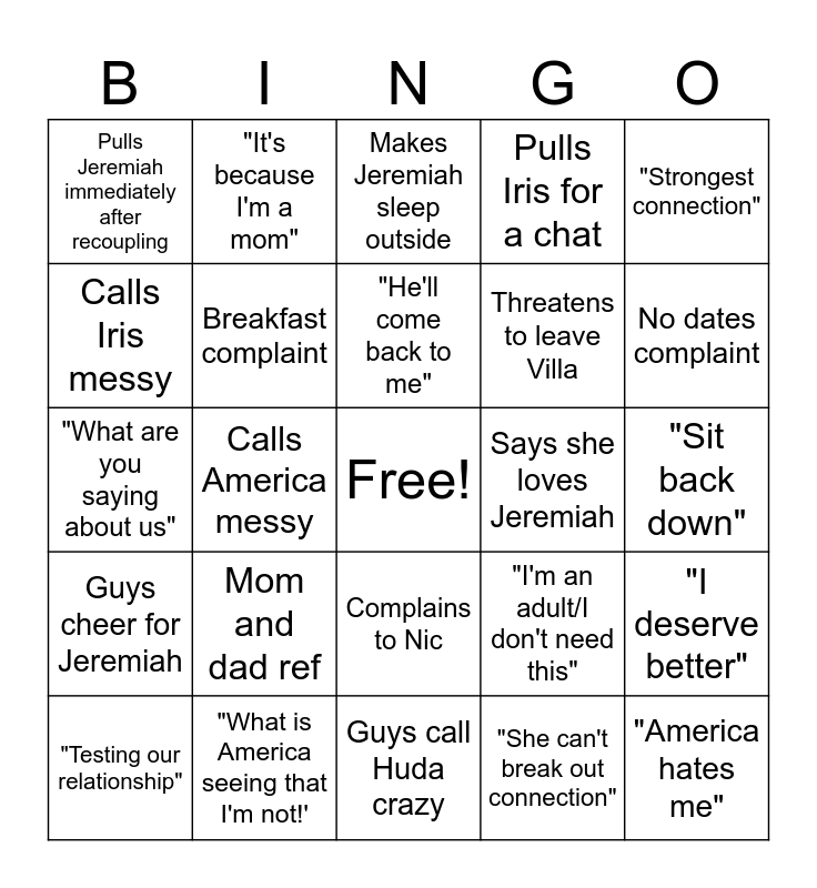 This bingo card has a free space and 24 words: Mom and dad ref, "What is America seeing that I'm not!', "He'll come back to me", "Testing our relationship", "Strongest connection", Pulls Jeremiah immediately after recoupling, Calls Iris messy, "It's because I'm a mom", Says she loves Jeremiah, Complains to Nic, Threatens to leave Villa, "What are you saying about us", "I'm an adult/I don't need this", "I deserve better", Breakfast complaint, "She can't break out connection", "Sit back down", Makes Jeremiah sleep outside, No dates complaint, Calls America messy, "America hates me", Guys cheer for Jeremiah, Pulls Iris for a chat and Guys call Huda crazy.