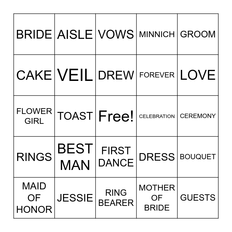 This bingo card has a free space and 24 words: BEST MAN, JESSIE, DREW, MAID OF HONOR, GROOM, BRIDE, CAKE, AISLE, CELEBRATION, FIRST DANCE, FOREVER, FLOWER GIRL, DRESS, BOUQUET, VEIL, MOTHER OF BRIDE, CEREMONY, VOWS, LOVE, TOAST, GUESTS, RINGS, MINNICH and RING BEARER.