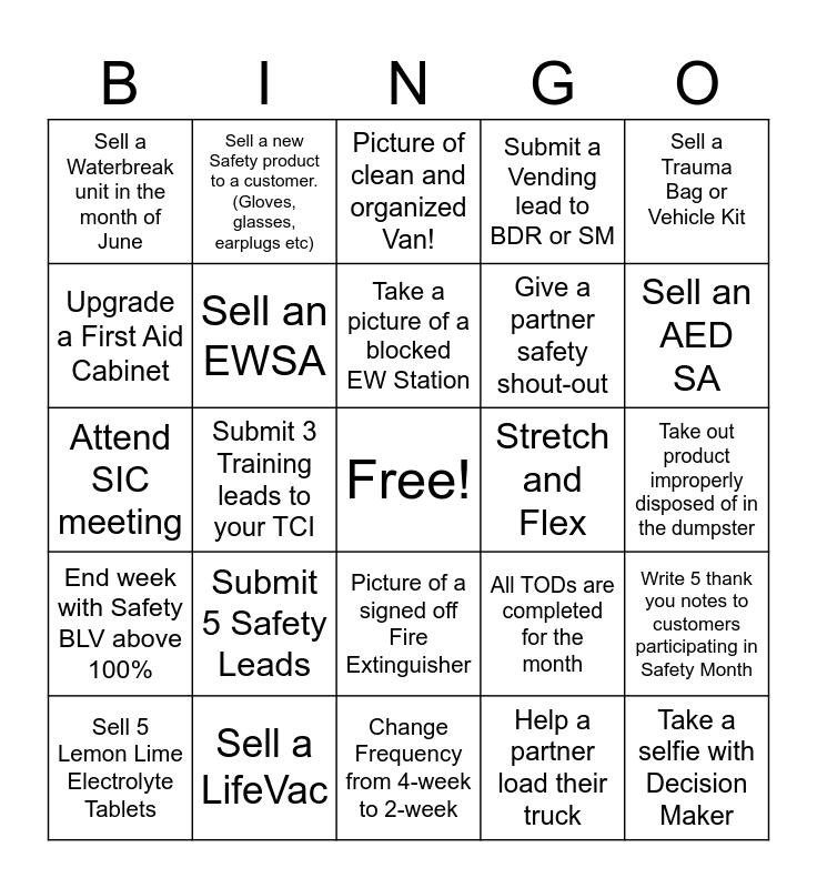 This bingo card has a free space and 24 words: Submit 5 Safety Leads, Sell a LifeVac, Take a picture of a blocked EW Station, Sell 5 Lemon Lime Electrolyte Tablets, Sell a Trauma Bag or Vehicle Kit, Sell a Waterbreak unit in the month of June, Upgrade a First Aid Cabinet, Sell a new Safety product to a customer. (Gloves, glasses, earplugs etc), Stretch and Flex, Picture of a signed off Fire Extinguisher, Give a partner safety shout-out, Attend SIC meeting, All TODs are completed for the month, Write 5 thank you notes to customers participating in Safety Month, Sell an EWSA, Help a partner load their truck, Take out product improperly disposed of in the dumpster, Picture of clean and organized Van!, Sell an AED SA, Submit 3 Training leads to your TCI, Take a selfie with Decision Maker, End week with Safety BLV above 100%, Submit a Vending lead to BDR or SM and Change Frequency from 4-week to 2-week.