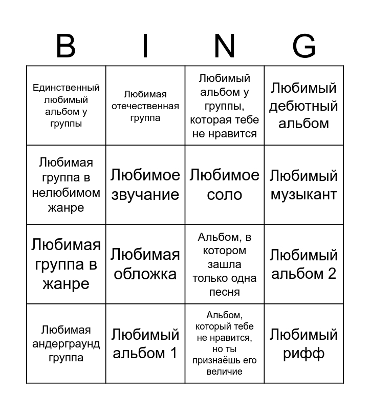 This bingo card has 16 words: Любимый альбом 1, Любимый альбом 2, Любимый альбом у группы, которая тебе не нравится, Единственный любимый альбом у группы, Любимая группа в жанре, Любимая отечественная группа, Альбом, в котором зашла только одна песня, Альбом, который тебе не нравится, но ты признаёшь его величие, Любимая группа в нелюбимом жанре, Любимое звучание, Любимая андерграунд группа, Любимый дебютный альбом, Любимая обложка, Любимый музыкант, Любимое соло and Любимый рифф.