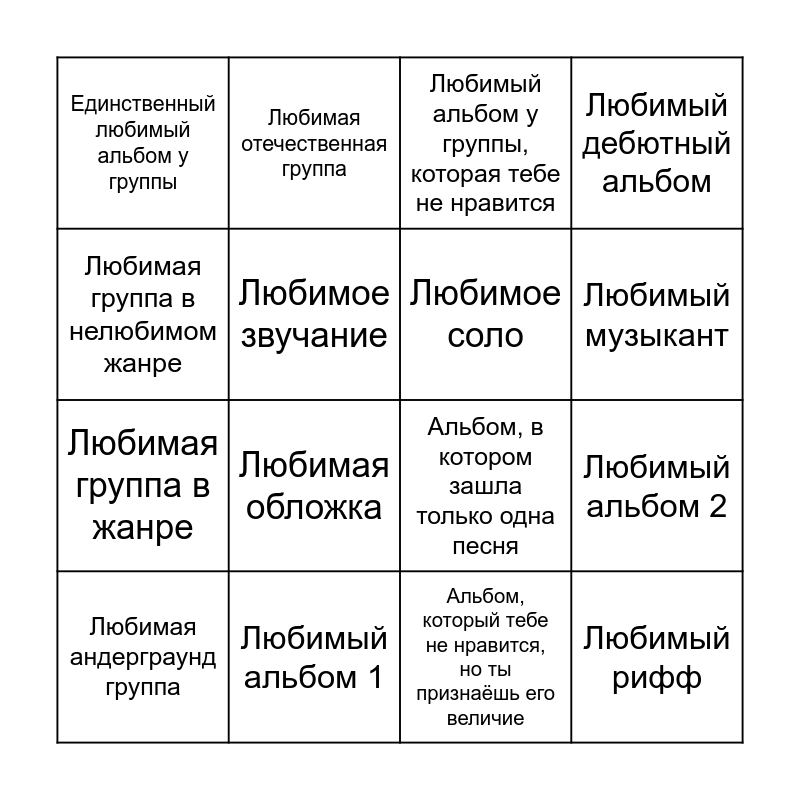 This bingo card has 16 words: Любимый альбом 1, Любимый альбом 2, Любимый альбом у группы, которая тебе не нравится, Единственный любимый альбом у группы, Любимая группа в жанре, Любимая отечественная группа, Альбом, в котором зашла только одна песня, Альбом, который тебе не нравится, но ты признаёшь его величие, Любимая группа в нелюбимом жанре, Любимое звучание, Любимая андерграунд группа, Любимый дебютный альбом, Любимая обложка, Любимый музыкант, Любимое соло and Любимый рифф.