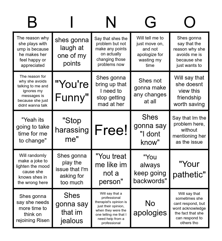This bingo card has a free space and 24 words: Shes gonna play the issue that I'm asking for too much, Shes gonna say that im jealous, Shes gonna bring up that I need to stop getting mad at her, Shes gonna say she needs more time to think on rejoining Risen, Shes gonna say that the reason why she avoids me is because she just wants to, The reason why she plays with ump is because he makes her feel happy or appreciated, The reason for why she avoids talking to me and ignores my messages is because she just didnt wanna talk, shes gonna laugh at one of my points, Shes gonna say "I dont know", "You treat me like im not a person", Shes not gonna make any changes at all, "Yeah its going to take time for me to change", "You always keep going backwords", "Your pathetic", "You're Funny", No apologies, Say that Im the problem here, without mentioning her as the issue, Say that shes the problem but not make any points on actually changing those problems now, Will say that she doesnt view this friendship worth saving, "Stop harassing me", Will say that sometimes she cant respond, but wont acknowledge the fact that she can respond to others tho, Will randomly make a joke to lighten the mood cause she knows shes in the wrong here, Will tell me to just move on, and not apologize for wasting my time and Will say that a professional therapist's opinion is just their opinion, when they were the one telling me that I need help from a professional.