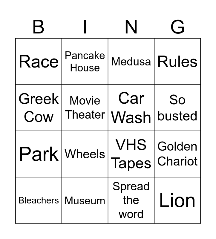 This bingo card has 16 words: Museum, Golden Chariot, Medusa, Race, Park, Pancake House, VHS Tapes, Spread the word, Greek Cow, Movie Theater, Bleachers, Rules, Wheels, So busted, Car Wash and Lion.