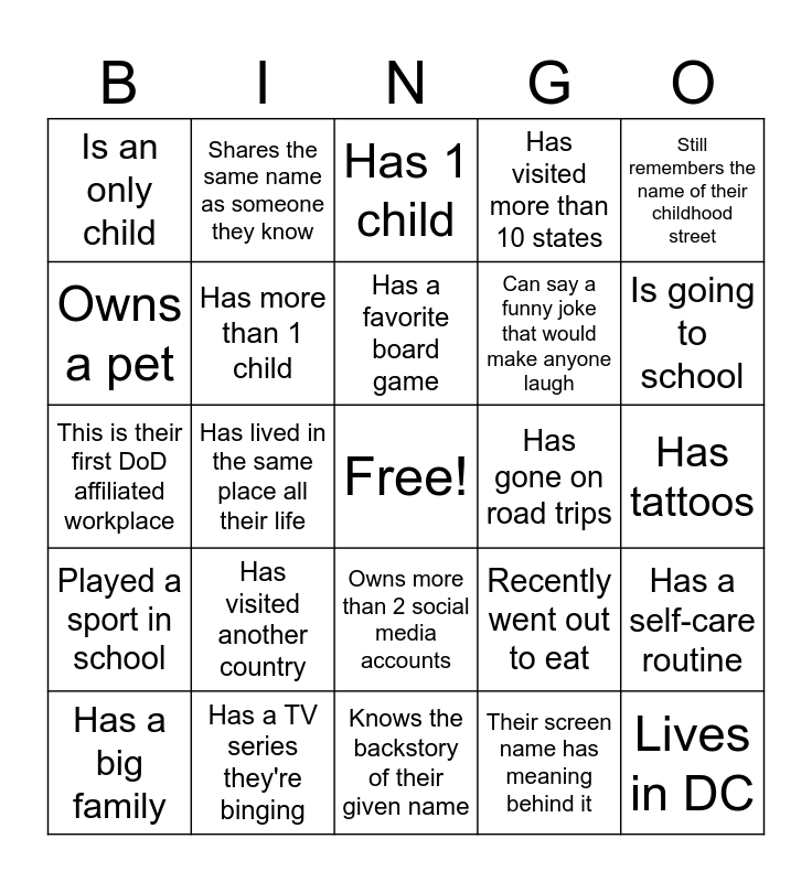 This bingo card has a free space and 29 words: Has a big family, Favorite color is a primary color, Has lived in the same place all their life, Has won an award, Is an only child, Has 1 child, Has more than 1 child, Has visited another country, Has gone on road trips, Has a TV series they're binging, Has tattoos, Lives in DC, Knows the backstory of their given name, Their screen name has meaning behind it, Is going to school, Likes to read, Owns more than 2 social media accounts, Played a sport in school, Still remembers the name of their childhood street, This is their first DoD affiliated workplace, Recently went out to eat, Knows their zodiac sign, Can say a funny joke that would make anyone laugh, Owns a pet, Has visited more than 10 states, Shares the same name as someone they know, Has a self-care routine, Has a favorite board game and Prefers in-person teambuilding.
