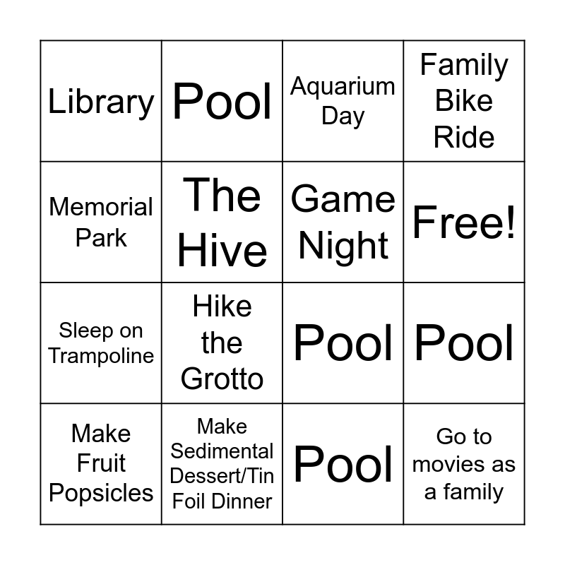 This bingo card has 17 words: Pool, Make Fruit Popsicles, Aquarium Day, Library, Hike the Grotto, Family Bike Ride, Pool, Game Night, Free!, The Hive, Make Sedimental Dessert/Tin Foil Dinner, Pool, Memorial Park, Pool, Sleep on Trampoline, Zoo Day and Go to movies as a family.