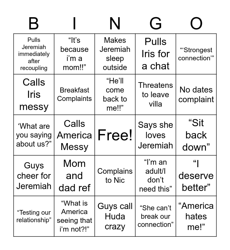 This bingo card has a free space and 24 words: Mom and dad ref, “What is America seeing that i’m not?!”, “He’ll come back to me!!”, “Testing our relationship”, “‘Strongest connection’”, Pulls Jeremiah immediately after recoupling, Calls Iris messy, “It’s because i’m a mom!!”, Says she loves Jeremiah, Complains to Nic, Threatens to leave villa, ‘What are you saying about us?”, “I’m an adult/I don’t need this”, “I deserve better”, Breakfast Complaints, “She can’t break our connection”, “Sit back down”, Makes Jeremiah sleep outside, No dates complaint, Calls America Messy, “America hates me!”, Guys cheer for Jeremiah, Pulls Iris for a chat and Guys call Huda crazy.