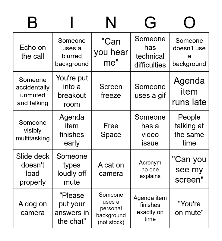 This bingo card has a free space and 24 words: Someone types loudly off mute, "Please put your answers in the chat", Screen freeze, A dog on camera, Someone doesn't use a background, Echo on the call, Someone accidentally unmuted and talking, Someone uses a blurred background, Someone has a video issue, A cat on camera, Someone uses a gif, Someone visibly multitasking, Acronym no one explains, "Can you see my screen", You're put into a breakout room, Agenda item finishes exactly on time, People talking at the same time, "Can you hear me", Agenda item runs late, Agenda item finishes early, "You're on mute", Slide deck doesn't load properly, Someone has technical difficulties and Someone uses a personal background (not stock).