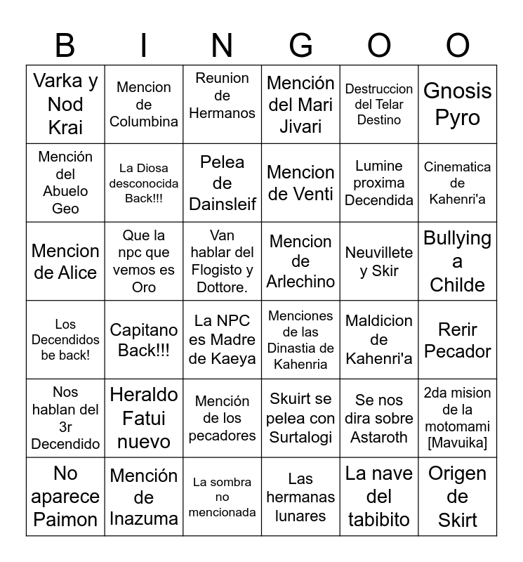 This bingo card has 36 words: Skuirt se pelea con Surtalogi, Mención de los pecadores, Las hermanas lunares, Mención del Abuelo Geo, Los Decendidos be back!, Mencion de Arlechino, La Diosa desconocida Back!!!, La sombra no mencionada, Destruccion del Telar Destino, Se nos dira sobre Astaroth, Cinematica de Kahenri'a, Mención del Mari Jivari, 2da mision de la motomami [Mavuika], Que la npc que vemos es Oro, Mencion de Venti, Varka y Nod Krai, Nos hablan del 3r Decendido, Neuvillete y Skir, Mencion de Alice, Reunion de Hermanos, Van hablar del Flogisto y Dottore., Capitano Back!!!, Menciones de las Dinastia de Kahenria, La NPC es Madre de Kaeya, Maldicion de Kahenri'a, Mencion de Columbina, Lumine proxima Decendida, Mención de Inazuma, Pelea de Dainsleif, Gnosis Pyro, Origen de Skirt, No aparece Paimon, Rerir Pecador, Bullying a Childe, Heraldo Fatui nuevo and La nave del tabibito.