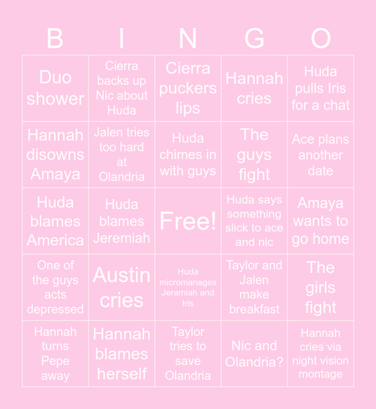 This bingo card has a free space and 24 words: Austin cries, Hannah blames herself, Huda chimes in with guys, Hannah turns Pepe away, Huda pulls Iris for a chat, Duo shower, Hannah disowns Amaya, Cierra backs up Nic about Huda, Huda says something slick to ace and nic, Huda micromanages Jeramiah and Iris, The guys fight, Huda blames America, Taylor and Jalen make breakfast, The girls fight, Jalen tries too hard at Olandria, Nic and Olandria?, Amaya wants to go home, Cierra puckers lips, Ace plans another date, Huda blames Jeremiah, Hannah cries via night vision montage, One of the guys acts depressed, Hannah cries and Taylor tries to save Olandria.