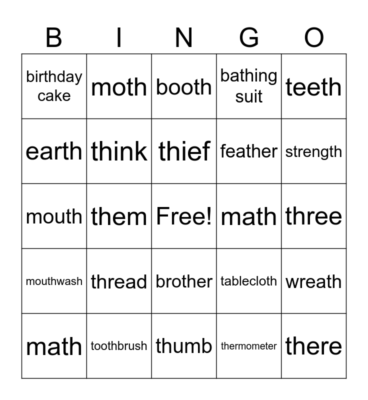 This bingo card has a free space and 25 words: thread, thumb, thief, math, teeth, birthday cake, earth, moth, math, brother, feather, mouth, tablecloth, wreath, think, thirsty, three, booth, strength, them, there, toothbrush, mouthwash, bathing suit and thermometer.