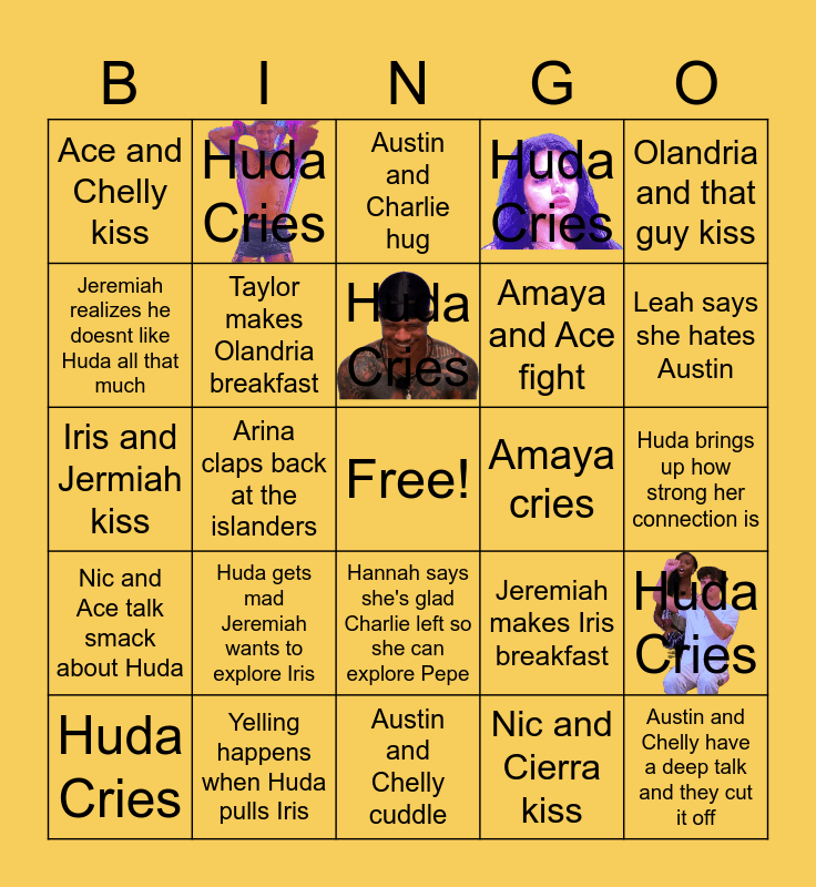 This bingo card has 5 images, a free space and 29 words: Huda Cries, Hannah kisses Pepe on the date, Arina claps back at the islanders, Iris tells Ace shes sorry, Ace and Chelly kiss, Austin and Charlie hug, Taylor makes Olandria breakfast, Huda gets mad Jeremiah wants to explore Iris, Amaya cries, Yelling happens when Huda pulls Iris, Huda brings up how strong her connection is, Austin and Chelly have a deep talk and they cut it off, Austin and Chelly cuddle, Nic and Cierra kiss, Leah says she hates Austin, The triple date is on the beach, Hannah says she's glad Charlie left so she can explore Pepe, Nic and Ace talk smack about Huda, Olandria and that guy kiss, Iris and Jermiah kiss, Jeremiah makes Iris breakfast, Huda threatens to leave the villa, Amaya and Ace fight, Jeremiah realizes he doesnt like Huda all that much, Huda Cries, Huda Cries, Huda Cries, Huda Cries and Huda Cries.