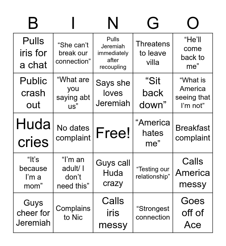 This bingo card has a free space and 25 words: “I’m an adult/ I don’t need this”, Calls iris messy, Says she loves Jeremiah, Guys cheer for Jeremiah, “He’ll come back to me”, Pulls iris for a chat, Public crash out, “She can’t break our connection”, “America hates me”, Guys call Huda crazy, “Sit back down”, Huda cries, “Testing our relationship”, Calls America messy, “What are you saying abt us”, Mom and dad ref, Breakfast complaint, Pulls Jeremiah immediately after recoupling, “What is America seeing that I’m not”, No dates complaint, Goes off of Ace, Complains to Nic, “It’s because I’m a mom”, Threatens to leave villa and “Strongest connection.