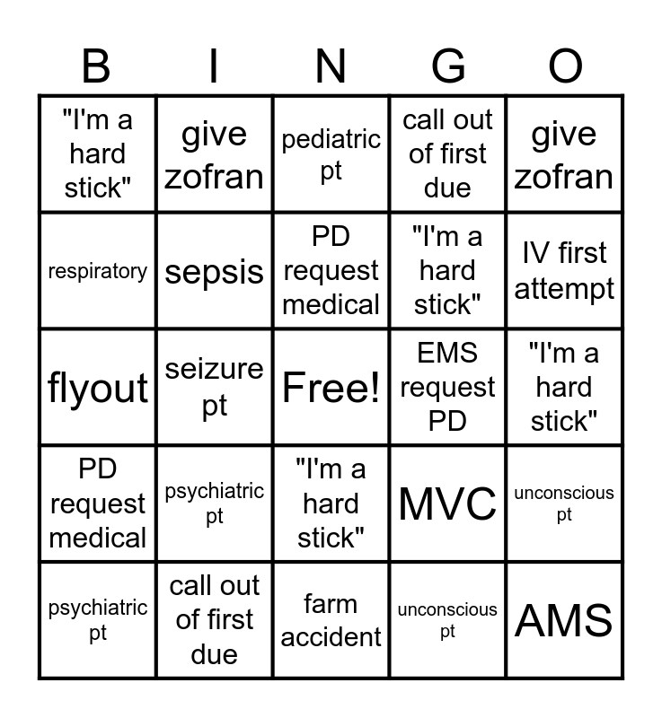 This bingo card has a free space and 162 words: interruption of a meal, PD request medical, cardiac arrest, 2 medic response on dispatch, IV first attempt, priority 1, public assist, engine company on dispatch, STEMI, stroke, respiratory, give zofran, pediatric pt, flyout, MVC, allergy to penicillin, refusal, nursing home/assisted living, unconscious pt, priority 4, information only consult, OB pt, seizure pt, trauma, AMS, diabetic problems, "I'm a hard stick", psychiatric pt, ETOH on board, OD, give narcan, accidental medical alarm activation, transfer, call out of first due, frequent flyer, EMS request PD, interruption of a meal, PD request medical, cardiac arrest, 2 medic response on dispatch, IV first attempt, priority 1, public assist, engine company on dispatch, STEMI, stroke, respiratory, give zofran, give 2+ meds, pediatric pt, flyout, MVC, allergy to penicillin, refusal, nursing home/assisted living, unconscious pt, priority 4, information only consult, OB pt, seizure pt, AMS, diabetic problems, "I'm a hard stick", psychiatric pt, ETOH on board, OD, give narcan, accidental medical alarm activation, transfer, call out of first due, frequent flyer, EMS request PD, sepsis, specialty trauma, ground transport to specialty center, consult for destination determination, farm accident, animal bite, interruption of a meal, PD request medical, cardiac arrest, 2 medic response on dispatch, IV first attempt, priority 1, public assist, engine company on dispatch, STEMI, stroke, respiratory, give zofran, give 2+ meds, pediatric pt, flyout, MVC, allergy to penicillin, refusal, nursing home/assisted living, unconscious pt, priority 4, information only consult, OB pt, seizure pt, AMS, diabetic problems, "I'm a hard stick", psychiatric pt, ETOH on board, OD, give narcan, accidental medical alarm activation, transfer, call out of first due, frequent flyer, EMS request PD, sepsis, specialty trauma, ground transport to specialty center, consult for destination determination, farm accident, animal bite, interruption of a meal, PD request medical, cardiac arrest, 2 medic response on dispatch, IV first attempt, priority 1, public assist, engine company on dispatch, STEMI, stroke, respiratory, give zofran, give 2+ meds, pediatric pt, flyout, MVC, allergy to penicillin, refusal, nursing home/assisted living, unconscious pt, priority 4, information only consult, OB pt, seizure pt, AMS, diabetic problems, "I'm a hard stick", psychiatric pt, ETOH on board, OD, give narcan, accidental medical alarm activation, transfer, call out of first due, frequent flyer, EMS request PD, sepsis, specialty trauma, ground transport to specialty center, consult for destination determination, farm accident and animal bite.