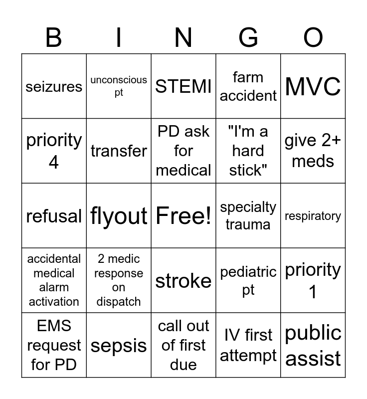 This bingo card has a free space and 42 words: interruption of a meal, PD ask for medical, cardiac arrest, 2 medic response on dispatch, IV first attempt, priority 1, public assist, engine company/FD on dispatch, STEMI, stroke, respiratory, give 2+ meds, flyout, MVC, zofran, pediatric pt, allergy to penicillin, refusal, nursing home/assisted living, unconscious pt, priority 4, information only consult, OB pt, seizures, AMS, diabetic problems, "I'm a hard stick", psychiatric pt, ETOH on board, OD, narcan, accidental medical alarm activation, transfer, call out of first due, frequent flyer, EMS request for PD, sepsis, specialty trauma, ground transport to specialty center, consult for destination determination, farm accident and animal bite.