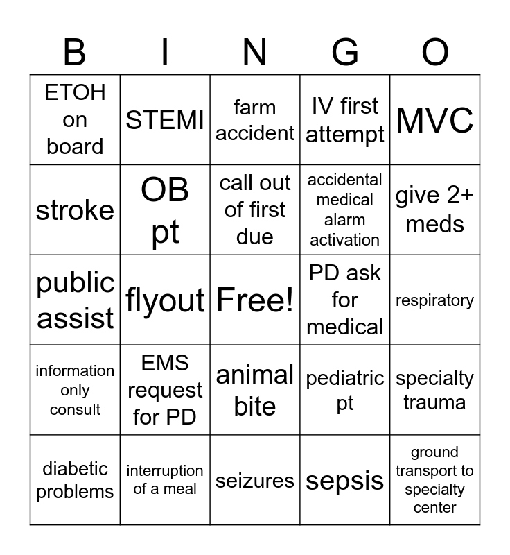 This bingo card has a free space and 42 words: transfer, call out of first due, frequent flyer, EMS request for PD, sepsis, specialty trauma, ground transport to specialty center, consult for destination determination, farm accident, animal bite, respiratory, give 2+ meds, flyout, MVC, zofran, pediatric pt, allergy to penicillin, public assist, engine company/FD on dispatch, STEMI, stroke, "I'm a hard stick", psychiatric pt, ETOH on board, OD, narcan, accidental medical alarm activation, refusal, nursing home/assisted living, unconscious pt, priority 4, information only consult, OB pt, seizures, AMS, diabetic problems, interruption of a meal, PD ask for medical, cardiac arrest, 2 medic response on dispatch, IV first attempt and priority 1.