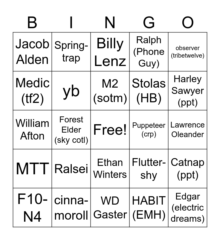 This bingo card has a free space and 24 words: Ralsei, cinna- moroll, M2 (sotm), F10-N4, observer (tribetwelve), Jacob Alden, Medic (tf2), Spring-trap, Puppeteer (crp), Ethan Winters, Stolas (HB), William Afton, Flutter-shy, Catnap (ppt), yb, HABIT (EMH), Lawrence Oleander, Billy Lenz, Harley Sawyer (ppt), Forest Elder (sky cotl), Edgar (electric dreams), MTT, Ralph (Phone Guy) and WD Gaster.