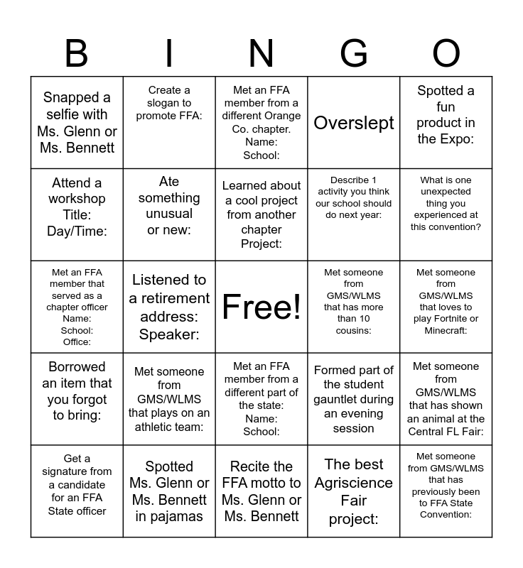 This bingo card has a free space and 24 words: Met someone from GMS/WLMS that plays on an athletic team:, Spotted Ms. Glenn or Ms. Bennett in pajamas, Learned about a cool project from another chapter Project:, Get a signature from a candidate for an FFA State officer, Spotted a fun product in the Expo:, Snapped a selfie with Ms. Glenn or Ms. Bennett, Attend a workshop Title: Day/Time:, Create a slogan to promote FFA:, Met someone from GMS/WLMS that has more than 10 cousins:, Met an FFA member from a different part of the state: Name: School:, Describe 1 activity you think our school should do next year:, Met an FFA member that served as a chapter officer Name: School: Office:, Formed part of the student gauntlet during an evening session, Met someone from GMS/WLMS that has shown an animal at the Central FL Fair:, Ate something unusual or new:, The best Agriscience Fair project:, Met someone from GMS/WLMS that loves to play Fortnite or Minecraft:, Met an FFA member from a different Orange Co. chapter. Name: School:, What is one unexpected thing you experienced at this convention?, Listened to a retirement address: Speaker:, Met someone from GMS/WLMS that has previously been to FFA State Convention:, Borrowed an item that you forgot to bring:, Overslept and Recite the FFA motto to Ms. Glenn or Ms. Bennett.