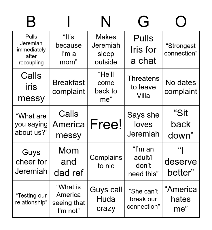 This bingo card has a free space and 24 words: Mom and dad ref, “What is America seeing that I’m not”, “He’ll come back to me”, “Testing our relationship”, “Strongest connection”, Pulls Jeremiah immediately after recoupling, Calls iris messy, “It’s because I’m a mom”, Says she loves Jeremiah, Complains to nic, Threatens to leave Villa, “What are you saying about us?”, “I’m an adult/I don’t need this”, “I deserve better”, Breakfast complaint, “She can’t break our connection”, “Sit back down”, Makes Jeremiah sleep outside, No dates complaint, Calls America messy, “America hates me”, Guys cheer for Jeremiah, Pulls Iris for a chat and Guys call Huda crazy.