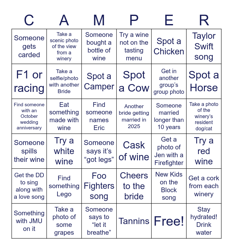 This bingo card has 42 words: Free!, Take a selfie/photo with another Bride, Something old, new, borrowed, & blue in one photo, Someone married longer than 10 years, Try a red wine, Try a white wine, Find someone with an October wedding anniversary, Take a bathroom selfie, Someone bought a bottle of wine, Take a photo of the winery’s resident dog/cat, Find someone names Eric, Spot a Cow, Spot a Horse, Spot a Chicken, Take a photo of some grapes, Someone spills their wine, Get a cork from each winery, Get in another group’s group photo, Stay hydrated! Drink water, Take a scenic photo of the view from a winery, Taylor Swift song, Foo Fighters song, Get the DD to sing along with a love song, Someone gets carded, Have a snack or lunch, Something with JMU on it, Spot a Camper, Pet a dog, Find something Lego, New Kids on the Block song, Someone engaged in 2024, Another bride getting married in 2025, F1 or racing, Get a photo of Jen with a Firefighter, Someone says to “let it breathe”, Someone says it’s “got legs”, Cask of wine, Eat something made with wine, Cheers to the bride, Tannins, Try a wine not on the tasting menu and A bottle of wine from the year Jen & Eric met (2022).