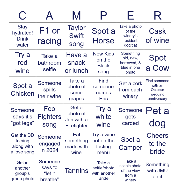 This bingo card has 41 words: Take a selfie/photo with another Bride, Something old, new, borrowed, & blue in one photo, Someone married longer than 10 years, Try a red wine, Try a white wine, Find someone with an October wedding anniversary, Take a bathroom selfie, Someone bought a bottle of wine, Take a photo of the winery’s resident dog/cat, Find someone names Eric, Spot a Cow, Spot a Horse, Spot a Chicken, Take a photo of some grapes, Someone spills their wine, Get a cork from each winery, Get in another group’s group photo, Stay hydrated! Drink water, Take a scenic photo of the view from a winery, Taylor Swift song, Foo Fighters song, Get the DD to sing along with a love song, Someone gets carded, Have a snack or lunch, Something with JMU on it, Spot a Camper, Pet a dog, Find something Lego, New Kids on the Block song, Someone engaged in 2024, Another bride getting married in 2025, F1 or racing, Get a photo of Jen with a Firefighter, Someone says to “let it breathe”, Someone says it’s “got legs”, Cask of wine, Eat something made with wine, Cheers to the bride, Tannins, Try a wine not on the tasting menu and A bottle of wine from the year Jen & Eric met (2022).