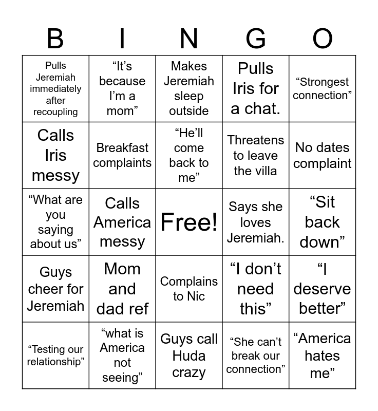 This bingo card has a free space and 24 words: Mom and dad ref, “what is America not seeing”, “He’ll come back to me”, “Testing our relationship”, “Strongest connection”, Pulls Jeremiah immediately after recoupling, Calls Iris messy, “It’s because I’m a mom”, Says she loves Jeremiah., Complains to Nic, Threatens to leave the villa, “What are you saying about us”, “I don’t need this”, “I deserve better”, Breakfast complaints, “She can’t break our connection”, “Sit back down”, Makes Jeremiah sleep outside, No dates complaint, Calls America messy, “America hates me”, Guys cheer for Jeremiah, Pulls Iris for a chat. and Guys call Huda crazy.