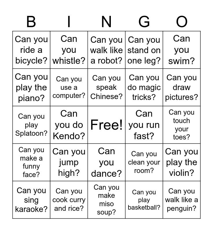 This bingo card has a free space and 24 words: Can you jump high?, Can you cook curry and rice?, Can you speak Chinese?, Can you sing karaoke?, Can you swim?, Can you ride a bicycle?, Can you play the piano?, Can you whistle?, Can you run fast?, Can you dance?, Can you do magic tricks?, Can you play Splatoon?, Can you clean your room?, Can you play the violin?, Can you use a computer?, Can you play basketball?, Can you touch your toes?, Can you walk like a robot?, Can you draw pictures?, Can you do Kendo?, Can you walk like a penguin?, Can you make a funny face?, Can you stand on one leg? and Can you make miso soup?.