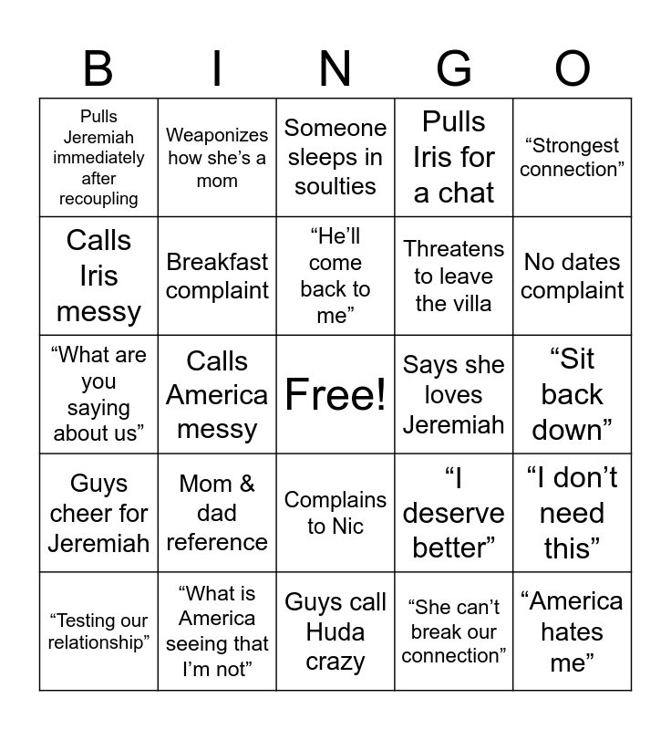 This bingo card has a free space and 24 words: Mom & dad reference, “What is America seeing that I’m not”, “He’ll come back to me”, “Testing our relationship”, “Strongest connection”, Pulls Jeremiah immediately after recoupling, Calls Iris messy, Weaponizes how she’s a mom, Says she loves Jeremiah, Complains to Nic, Threatens to leave the villa, “What are you saying about us”, “I deserve better”, “I don’t need this”, Breakfast complaint, “She can’t break our connection”, “Sit back down”, Someone sleeps in soulties, No dates complaint, Calls America messy, “America hates me”, Guys cheer for Jeremiah, Pulls Iris for a chat and Guys call Huda crazy.