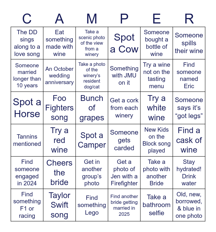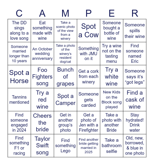 This bingo card has 38 words: Stay hydrated! Drink water, Take a photo with another Bride, Old, new, borrowed, & blue in one photo, Someone married longer than 10 years, Try a red wine, Try a white wine, An October wedding anniversary, Take a bathroom selfie, Someone bought a bottle of wine, Take a photo of the winery’s resident dog/cat, Find someone named Eric, Spot a Cow, Spot a Horse, Bunch of grapes, Someone spills their wine, Get a cork from each winery, Get in another group’s photo, Take a scenic photo of the view from a winery, Taylor Swift song, Foo Fighters song, The DD sings along to a love song, Someone gets carded, Something with JMU on it, Spot a Camper, Find something Lego, New Kids on the Block song played, Find someone engaged in 2024, Find another bride getting married in 2025, Find something F1 or racing, Get a photo of Jen with a Firefighter, Someone says to “let it breathe”, Someone says it’s “got legs”, Find a cask of wine, Eat something made with wine, Cheers the bride, Tannins mentioned, Try a wine not on the tasting menu and A bottle of wine from the year Jen & Eric met (2022).