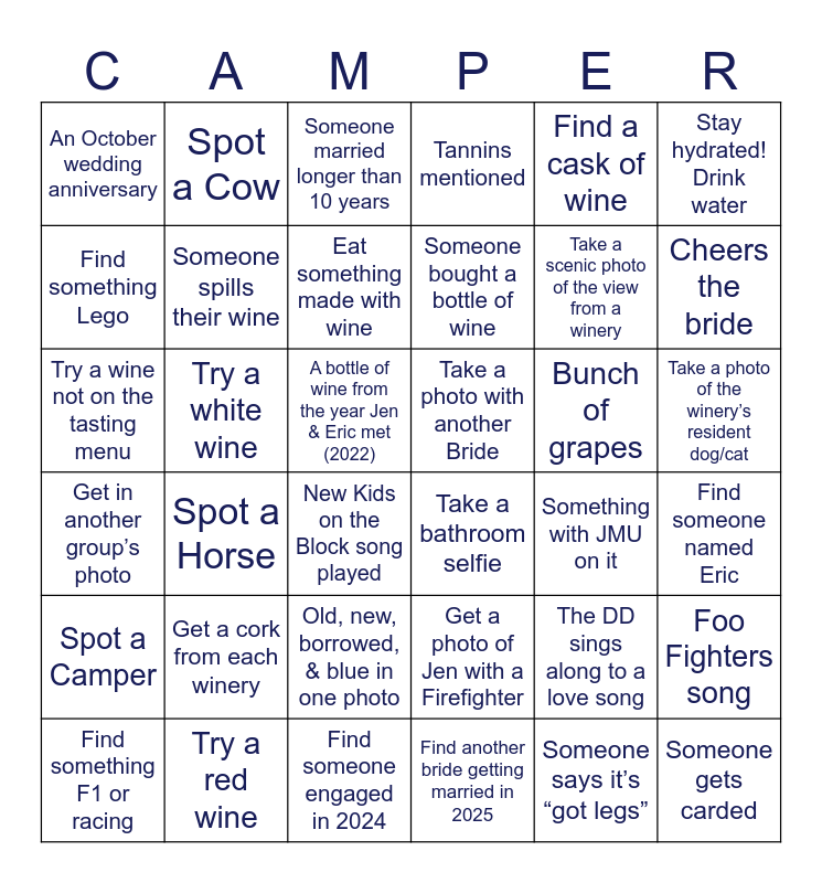 This bingo card has 38 words: Foo Fighters song, The DD sings along to a love song, Someone gets carded, Find something Lego, Spot a Horse, Bunch of grapes, Someone spills their wine, Someone says it’s “got legs”, Find a cask of wine, Eat something made with wine, Cheers the bride, Tannins mentioned, Try a wine not on the tasting menu, A bottle of wine from the year Jen & Eric met (2022), Stay hydrated! Drink water, Take a photo with another Bride, Old, new, borrowed, & blue in one photo, Someone married longer than 10 years, Try a red wine, Try a white wine, An October wedding anniversary, Take a bathroom selfie, Someone bought a bottle of wine, New Kids on the Block song played, Find someone engaged in 2024, Something with JMU on it, Spot a Camper, Find another bride getting married in 2025, Find something F1 or racing, Get a photo of Jen with a Firefighter, Someone says to “let it breathe”, Take a photo of the winery’s resident dog/cat, Find someone named Eric, Spot a Cow, Get a cork from each winery, Get in another group’s photo, Take a scenic photo of the view from a winery and Taylor Swift song.