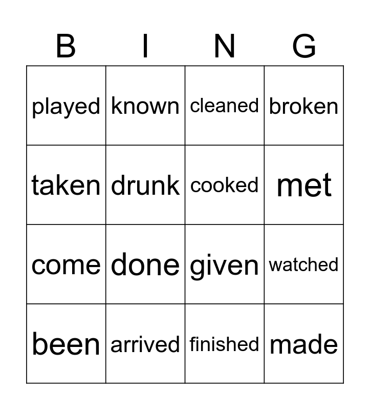 This bingo card has 30 words: Free!, talked, watched, opened, played, cleaned, cooked, visited, arrived, liked, finished, been, had, gone, done, seen, eaten, made, written, taken, given, said, known, come, drunk, broken, chosen, forgotten, met and found.