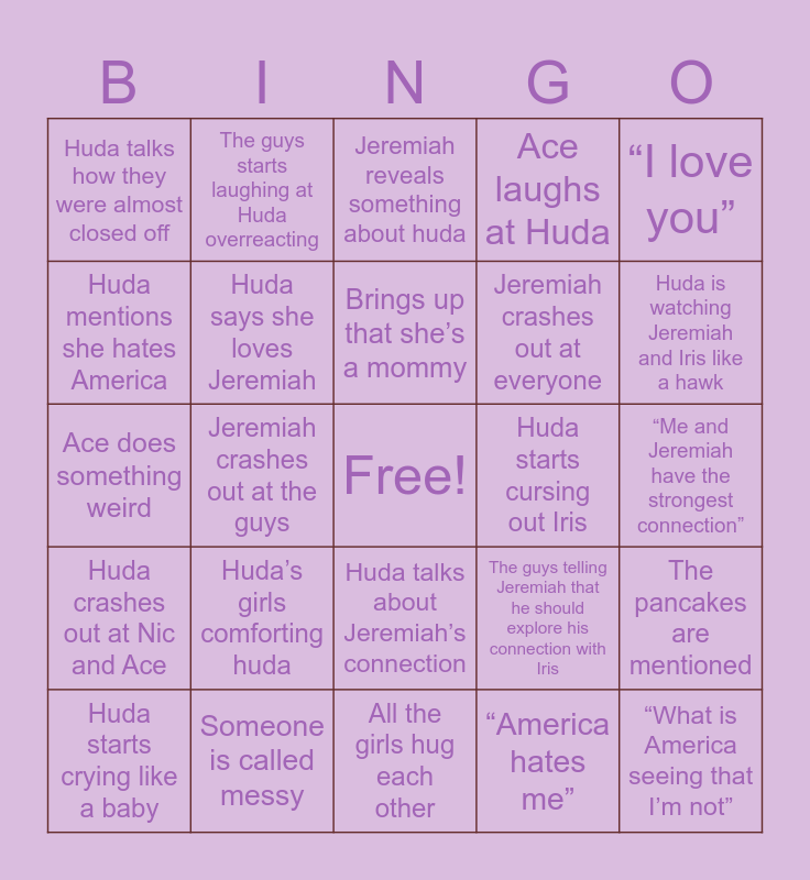 This bingo card has a free space and 24 words: Huda starts crying like a baby, Huda’s girls comforting huda, Brings up that she’s a mommy, “America hates me”, “I love you”, Huda talks how they were almost closed off, The guys starts laughing at Huda overreacting, Jeremiah reveals something about huda, Huda starts cursing out Iris, “Me and Jeremiah have the strongest connection”, Ace does something weird, Huda says she loves Jeremiah, The guys telling Jeremiah that he should explore his connection with Iris, The pancakes are mentioned, Huda mentions she hates America, Someone is called messy, All the girls hug each other, Ace laughs at Huda, Huda is watching Jeremiah and Iris like a hawk, Huda crashes out at Nic and Ace, Jeremiah crashes out at the guys, Huda talks about Jeremiah’s connection, Jeremiah crashes out at everyone and “What is America seeing that I’m not”.