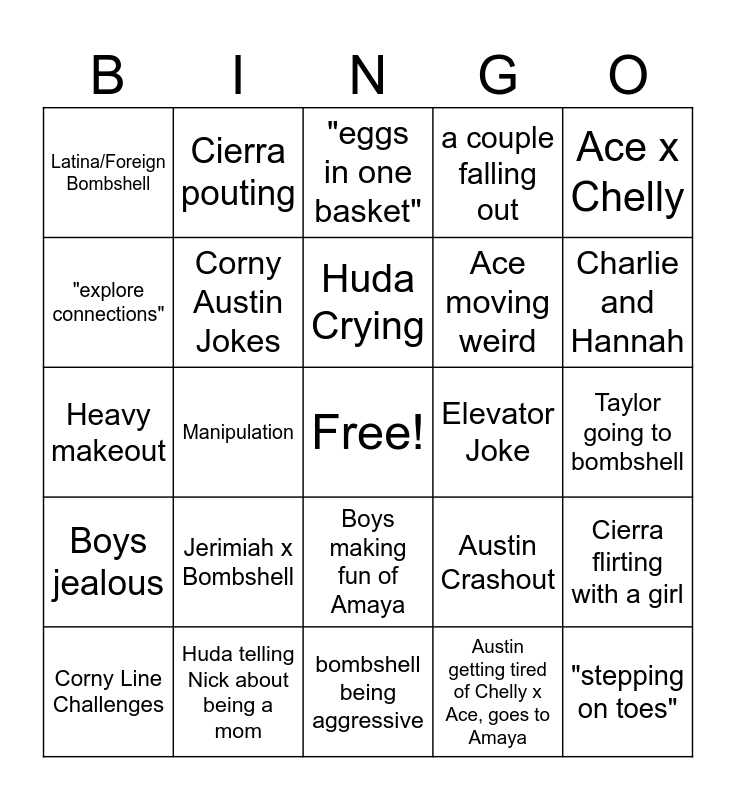 This bingo card has a free space and 24 words: Jerimiah x Bombshell, Huda telling Nick about being a mom, Huda Crying, Corny Line Challenges, Ace x Chelly, Latina/Foreign Bombshell, "explore connections", Cierra pouting, Elevator Joke, Boys making fun of Amaya, Ace moving weird, Heavy makeout, Austin Crashout, Cierra flirting with a girl, Corny Austin Jokes, Austin getting tired of Chelly x Ace, goes to Amaya, Taylor going to bombshell, "eggs in one basket", Charlie and Hannah, Manipulation, "stepping on toes", Boys jealous, a couple falling out and bombshell being aggressive.