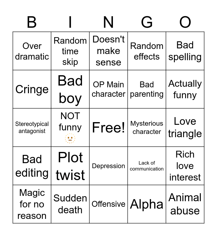 This bingo card has a free space and 24 words: Plot twist, Sudden death, OP Main character, Magic for no reason, Bad spelling, Over dramatic, Cringe, Random time skip, Mysterious character, Depression, Bad parenting, Stereotypical antagonist, Lack of communication, Rich love interest, Bad boy, Alpha, Love triangle, Doesn't make sense, Actually funny, NOT funny 🫥, Animal abuse, Bad editing, Random effects and Offensive.