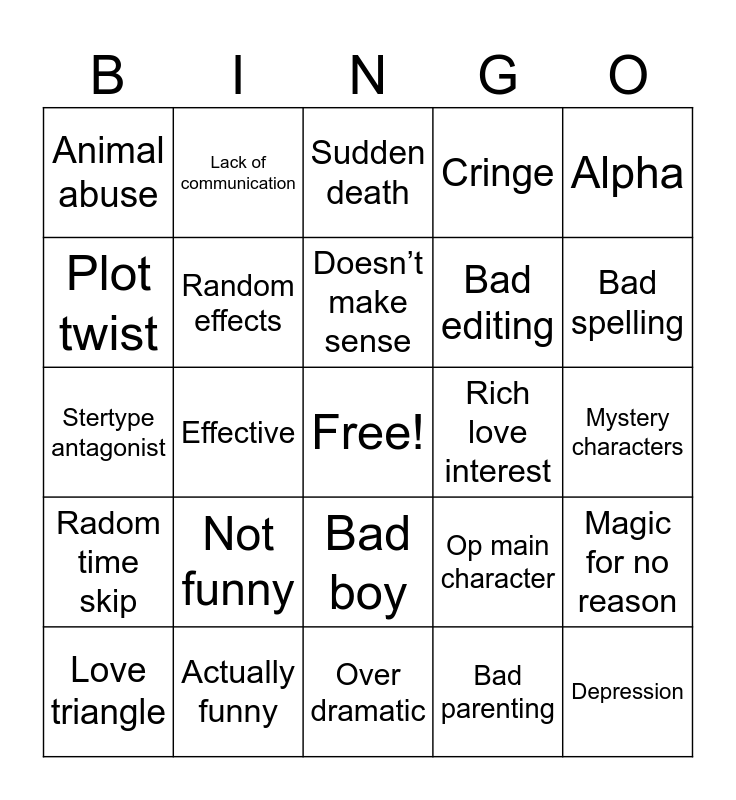 This bingo card has a free space and 24 words: Not funny, Actually funny, Doesn’t make sense, Love triangle, Alpha, Animal abuse, Plot twist, Lack of communication, Rich love interest, Bad boy, Bad editing, Stertype antagonist, Op main character, Magic for no reason, Random effects, Bad parenting, Mystery characters, Sudden death, Bad spelling, Effective, Depression, Radom time skip, Cringe and Over dramatic.