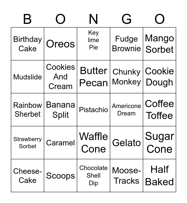 This bingo card has 35 words: Rocky Road, Cotton Candy, Bubble Gum, Cookies And Cream, Waffle Cone, Fudge Brownie, Mudslide, Hot Fudge Sunday, Butter Pecan, Sorbet, Rainbow Sherbet, Mango Sorbet, Mint Chocolate Chip, Rainbow Sprinkles, Birthday Cake, Americone Dream, Moose- Tracks, Banana Split, Strawberry Sorbet, Pistachio, Gelato, Cheese- Cake, Sugar Cone, Scoops, Key lime Pie, Cookie Dough, Half Baked, The tonight Dough, Chunky Monkey, Coffee Toffee, Peanut Butter Cup, Chocolate Shell Dip, Caramel, Oreos and Fro Yo.