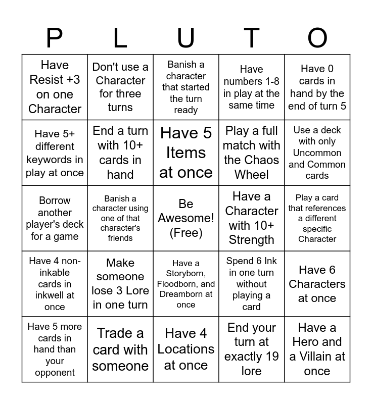 This bingo card has a free space and 63 words: Have 4 Floodborn Characters at once, Play a game with 4+ players (not 2v2), Have 3 of the same Character at once, Have 6 Characters at once, Successfully call a topdeck, Shift onto an already shifted card, Don't use a Character for three turns, Have 10 Characters in your discard pile, Have 5 Items at once, Ask for "just one more turn" and be granted it, Have a Storyborn, Floodborn, and Dreamborn at once, Complete 2+ other boxes in a game, Play a card that references a different specific Character, Have 0 cards in hand by the end of turn 5, Use Support 2 times in one turn, Have 5+ different keywords in play at once, Banish a character using one of that character's friends, Have Resist +3 on one Character, Banish 5 Characters in one turn (yours count), Play a full match with the Chaos Wheel, Make someone lose 3 Lore in one turn, Have 4 non-inkable cards in inkwell at once, Have numbers 1-8 in play at the same time, Play 4 Songs in one turn, Have a Character at a Location they normally are, Gain 4 Lore without questing, Put 4 copies of the same card into ink, Add the whole pack to your deck (wrong colors are ink-only), Have 2 Dual-Ink cards in play at once, Use a deck with only 1 ink color, Remove 5 damage in a turn, Finish a game without challenging, Finish a game with 5 or fewer Ink, Make a Character sing a Song they normally do, Use a deck with only Uncommon and Common cards, Have 5 more cards in hand than your opponent, Play an action, location, and character in the same turn, End your turn at exactly 19 lore, Finish a game with 10- cards in deck, End a turn with 10+ cards in hand, Borrow another player's deck for a game, Have a Character with 10+ Strength, Have a Pirate and a Racer at once, Use a deck with 80+ cards, Have a Hero and a Villain at once, Trade a card with someone, Have 3 Characters at one Location, Spend 6 Ink in one turn without playing a card, Use a deck with no duplicate cards, Remove 4 damage from characters in one turn, Sing 9+ cost worth of Songs in one turn, Have 4 Locations at once, Have 15 Ink, Have 10+ types in play, Win with 27+ Lore, Banish a character that started the turn ready, Have 3 Characters each with 1 remaining Willpower, Play a 2 vs 2 game (first team to 30 lore), Play 4 Non-Song Actions in one turn, Make 10 Lore in one turn, Be 10 lore behind and then win, Tell a joke that makes someone laugh (pity counts) and Make someone lose Lore while they have 0 Lore.