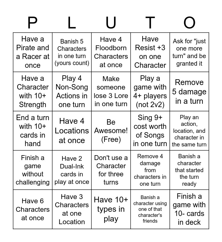 This bingo card has a free space and 63 words: Have 5 Items at once, Have numbers 1-8 in play at the same time, Use a deck with only Uncommon and Common cards, Banish a character that started the turn ready, Gain 4 Lore without questing, End your turn at exactly 19 lore, Banish 5 Characters in one turn (yours count), Make someone lose Lore while they have 0 Lore, Make someone lose 3 Lore in one turn, Have 3 Characters each with 1 remaining Willpower, Don't use a Character for three turns, Finish a game with 5 or fewer Ink, Play an action, location, and character in the same turn, Ask for "just one more turn" and be granted it, Be 10 lore behind and then win, Have a Character with 10+ Strength, Have 4 Locations at once, Have a Pirate and a Racer at once, Play a 2 vs 2 game (first team to 30 lore), Play a game with 4+ players (not 2v2), Have 2 Dual-Ink cards in play at once, Finish a game without challenging, Have Resist +3 on one Character, Have a Hero and a Villain at once, Make a Character sing a Song they normally do, Use Support 2 times in one turn, Win with 27+ Lore, Complete 2+ other boxes in a game, Have a Storyborn, Floodborn, and Dreamborn at once, Have 0 cards in hand by the end of turn 5, Borrow another player's deck for a game, Add the whole pack to your deck (wrong colors are ink-only), Make 10 Lore in one turn, Play a card that references a different specific Character, Remove 5 damage in a turn, Have 6 Characters at once, Successfully call a topdeck, Banish a character using one of that character's friends, Play 4 Songs in one turn, Play 4 Non-Song Actions in one turn, End a turn with 10+ cards in hand, Sing 9+ cost worth of Songs in one turn, Use a deck with 80+ cards, Tell a joke that makes someone laugh (pity counts), Finish a game with 10- cards in deck, Have 3 Characters at one Location, Have 15 Ink, Remove 4 damage from characters in one turn, Have 5+ different keywords in play at once, Spend 6 Ink in one turn without playing a card, Use a deck with no duplicate cards, Have 10+ types in play, Have 10 Characters in your discard pile, Have 3 of the same Character at once, Use a deck with only 1 ink color, Have 4 Floodborn Characters at once, Have 4 non-inkable cards in inkwell at once, Have 5 more cards in hand than your opponent, Put 4 copies of the same card into ink, Have a Character at a Location they normally are, Trade a card with someone, Play a full match with the Chaos Wheel and Shift onto an already shifted card.