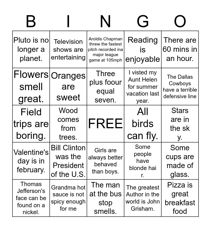 This bingo card has a free space and 24 words: Bill Clinton was the President of the U.S., Grandma hot sauce is not spicy enough for me, Three plus foour equal seven., Thomas Jefferson's face can be found on a nickel., There are 60 mins in an hour., Pluto is no longer a planet., Flowers smell great., Television shows are entertaining, All birds can fly., Girls are always better behaved than boys., I visted my Aunt Helen for summer vacation last year., Field trips are boring., Some people have blonde hair., Some cups are made of glass., Oranges are sweet, The greatest Author in the world is John Grisham., Stars are in the sky., Aroldis Chapman threw the fastest pitch recorded ina major league game at 105mph, The Dallas Cowboys have a terrible defensive line, Wood comes from trees., Pizza is great breakfast food, Valentine's day is in february., Reading is enjoyable and The man at the bus stop smells..