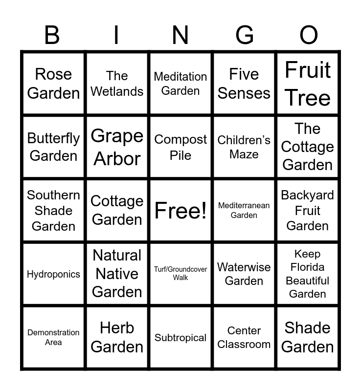 This bingo card has a free space and 34 words: Horticultural Learning, Center Classroom, Rain Garden, Vegetable Garden, Hydroponics, Grape Arbor, Fruit Tree, Demonstration Area, The Wetlands, Upland Walk, Compost Pile, Meditation Garden, Native Landscape, Southwest Garden, Mediterranean Garden, The Cottage Garden, Herb Garden, Southern Shade Garden, Natural Native Garden, Waterwise Garden, Turf/Groundcover Walk, Palm Walk, Rose Garden, Backyard Fruit Garden, Subtropical, Shade Garden, Five Senses, Backyard Habitat, Children’s Maze, Butterfly Garden, Orchid Greenhouse, Cottage Garden, Keep Florida Beautiful Garden and Native Garden.