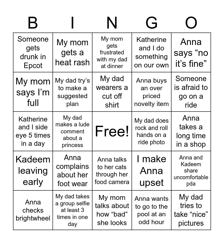 This bingo card has a free space and 24 words: Anna complains about her foot wear, My dad takes a group selfie at least 3 times in one day, My dad wearers a cut off shirt, Anna checks brightwheel, Anna says “no it’s fine”, Someone gets drunk in Epcot, My mom says I’m full, My mom gets a heat rash, My dad does rock and roll hands on a ride photo, Anna talks to her cats through her food camera, Anna buys an over priced novelty item, Katherine and I side eye 5 times in a day, I make Anna upset, Anna and Kadeem share uncomfortable pda, My dad try’s to make a suggested plan, Anna wants to go to the pool at an odd hour, Anna takes a long time in a shop, My mom gets frustrated with my dad at dinner, Someone is afraid to go on a ride, My dad makes a lude comment about a princess, My dad tries to take “nice” pictures, Kadeem leaving early, Katherine and I do something on our own and My mom talks about how “bad” she looks.