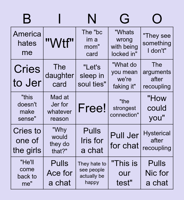 This bingo card has a free space and 24 words: "He'll come back to me", "Why would they do that?", "Let's sleep in soul ties", "This is our test", "They see something I don't", America hates me, "Wtf", The "bc im a mom" card, "the strongest connection", "How could you", "this doesn't make sense", The daughter card, Pull Jer for chat, Hysterical after recoupling, Cries to Jer, Pulls Ace for a chat, They hate to see people actually be happy, "Whats wrong with being locked in", The arguments after recoupling, Cries to one of the girls, Mad at Jer for whatever reason, Pulls Iris for a chat, "What do you mean we're faking it" and Pulls Nic for a chat.