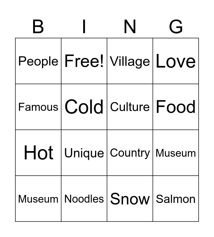 This bingo card has 32 words: Thailand, Asia, Museum, Happy, Salmon, Culture, Famous, Eyes, Free!, Outdoor, Food, Village, Fish, Cooking, Noodles, Boxing, Traditional, Country, Holiday, Popular, Rich, History, Snow, Bread, Museum, Love, Hot, Cold, People, Kind, World and Unique.