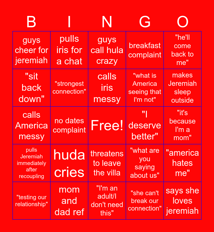This bingo card has a free space and 24 words: "testing our relationship", huda cries, calls iris messy, "she can't break our connection", "he'll come back to me", guys cheer for jeremiah, pulls iris for a chat, guys call hula crazy, "I deserve better", "it's because I'm a mom", calls America messy, "strongest connection", "what are you saying about us", "america hates me", "sit back down", mom and dad ref, "I'm an adult/I don't need this", breakfast complaint, makes Jeremiah sleep outside, pulls Jeremiah immediately after recoupling, no dates complaint, threatens to leave the villa, "what is America seeing that I'm not" and says she loves jeremiah.