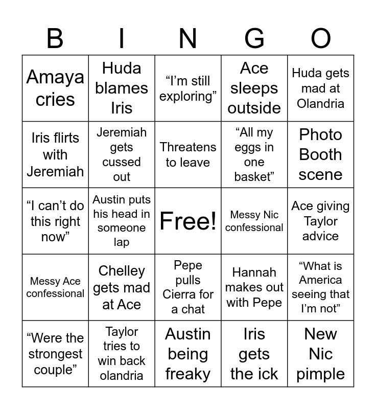 This bingo card has a free space and 24 words: “Were the strongest couple”, Chelley gets mad at Ace, Threatens to leave, Iris gets the ick, Huda gets mad at Olandria, Amaya cries, Huda blames Iris, “I’m still exploring”, Messy Nic confessional, Ace giving Taylor advice, “I can’t do this right now”, Jeremiah gets cussed out, Hannah makes out with Pepe, “What is America seeing that I’m not”, Iris flirts with Jeremiah, Taylor tries to win back olandria, Austin being freaky, Ace sleeps outside, Photo Booth scene, Messy Ace confessional, Austin puts his head in someone lap, Pepe pulls Cierra for a chat, “All my eggs in one basket” and New Nic pimple.