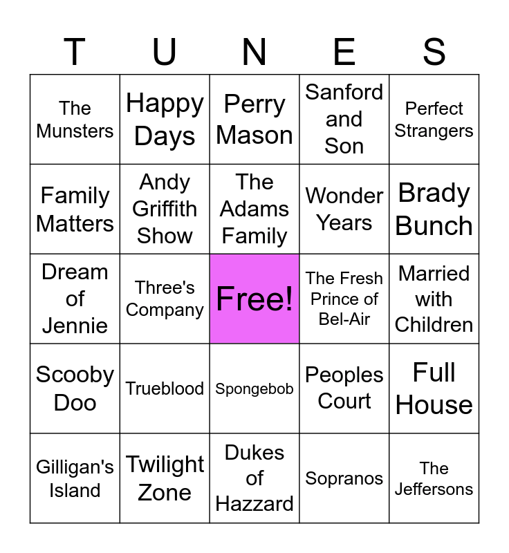 This bingo card has a free space and 53 words: All in the Family, The Jeffersons, Gi Joe, Sopranos, Trueblood, The Facts of Life, Happy Days, The Brady Bunch, Family Matters, Friends, Andy Griffith Show, Laverne & Shirley, Full House, Peoples Court, Golden Girls, Gilligan's Island, The Adams Family, The Fresh Prince of Bel-Air, The Monkees, Perfect Strangers, Three's Company, Cheers, Wonder Years, The Munsters, Gunsmoke, Twilight Zone, American Dad, Adams Family, Rawhide, Brady Bunch, Beverly Hillbillies, Johnny Carson Show, Price is Right, Flintstones, Green Acers, Cops, Sanford and Son, Dukes of Hazzard, Perry Mason, Mr Rogers Neighborhood, Star Trek, Love Boat, Married with Children, 60 mins, WKRP, Spongebob, Fresh Prince, Honeymooners, Dream of Jennie, Scooby Doo, Knight rider, A-Team and Have gun will Travel.
