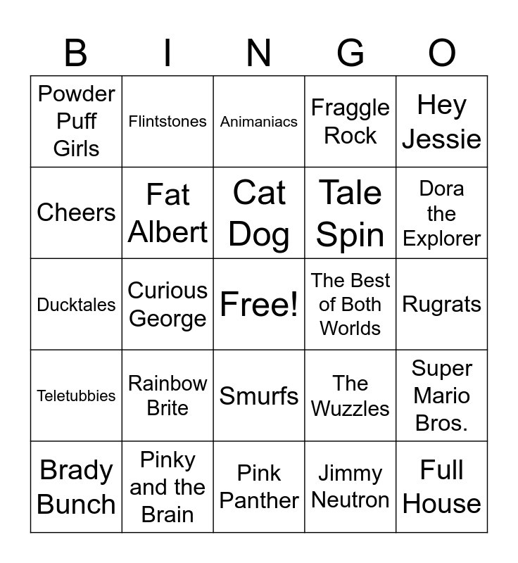 This bingo card has a free space and 74 words: Andy Griffith Show, Angry Beavers, Animaniacs, Barney, Bear in the Big Blue House, Big Bang Theory, Blue's Clues, Bob the Builder, Brady Bunch, Captain Planet, Care Bears, Casper the Friendly Ghost, Cat Dog, Cheers, Clarissa Explains it All, Curious George, Dexter's Laboratory, Dora the Explorer, Dragon Tales, Ducktales, Fat Albert, Flintstones, Fraggle Rock, Friends, Full House, Gilligan's Island, Gobots, Green Acres, Happy Days, Hey Arnold, Hey Jessie, Hogan's Heroes, I'm a Martian, Inspector Gadget, Jetsons, Jimmy Neutron, Justice League, Max and Ruby, Mega Man, Phinneas and Ferb, Pink Panther, Pinky and the Brain, Pokemon, Popeye, Pound Puppies, Powder Puff Girls, Power Rangers, Rainbow Brite, Reading Rainbow, Road Runner, Fresh Prince of Bel-Air, Rolie Polie Olie, Rugrats, Saved By the Bell, Scooby Doo, Sesame Street, Smurfs, Spiderman, Star Trek, Super Mario Bros., Tale Spin, Teenage Mutant Ninja Turtles, Teletubbies, That's so Raven, The Best of Both Worlds, The Fairly Odd Parents, The Magic School Bus, The Simpsons, The Wuzzles, Thomas the Tank, Tiny Toon, Two and a Half Men, Welcome Back Kotter and Where in the World is Carmen San Diego.