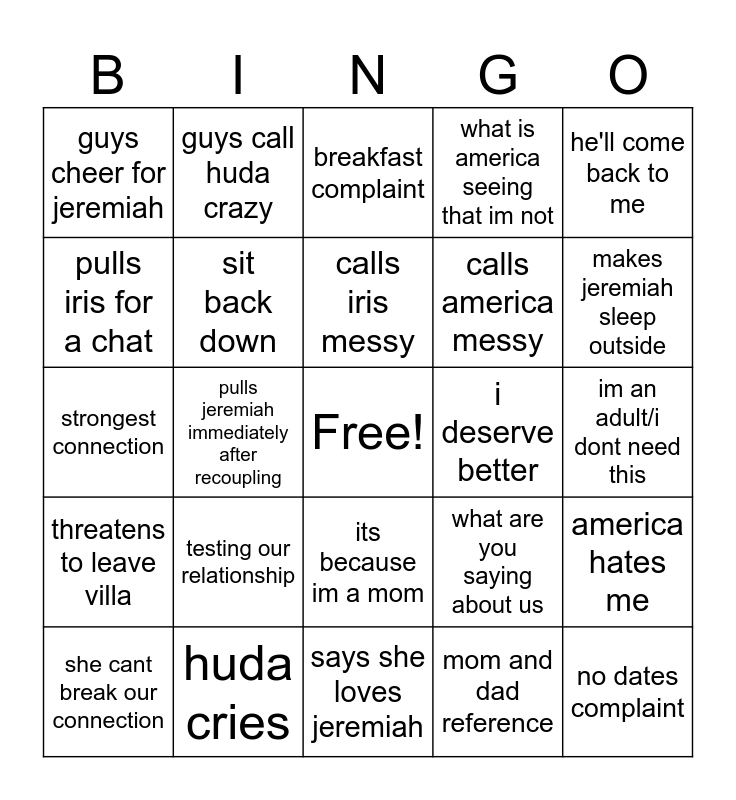 This bingo card has a free space and 24 words: testing our relationship, huda cries, calls iris messy, she cant break our connection, he'll come back to me, guys cheer for jeremiah, pulls iris for a chat, guys call huda crazy, i deserve better, its because im a mom, calls america messy, strongest connection, what are you saying about us, america hates me, sit back down, mom and dad reference, im an adult/i dont need this, breakfast complaint, makes jeremiah sleep outside, pulls jeremiah immediately after recoupling, no dates complaint, threatens to leave villa, what is america seeing that im not and says she loves jeremiah.