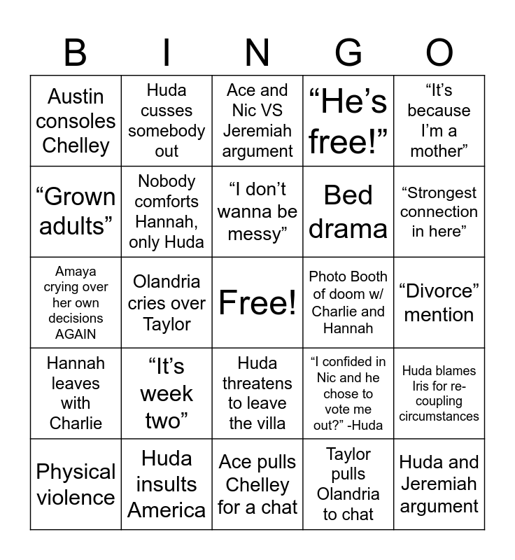 This bingo card has a free space and 24 words: Physical violence, “It’s week two”, “I don’t wanna be messy”, Taylor pulls Olandria to chat, “It’s because I’m a mother”, Austin consoles Chelley, Huda cusses somebody out, Ace and Nic VS Jeremiah argument, Photo Booth of doom w/ Charlie and Hannah, “Divorce” mention, Amaya crying over her own decisions AGAIN, Nobody comforts Hannah, only Huda, “I confided in Nic and he chose to vote me out?” -Huda, Huda blames Iris for re-coupling circumstances, “Grown adults”, Huda insults America, Ace pulls Chelley for a chat, “He’s free!”, “Strongest connection in here”, Hannah leaves with Charlie, Olandria cries over Taylor, Huda threatens to leave the villa, Bed drama and Huda and Jeremiah argument.